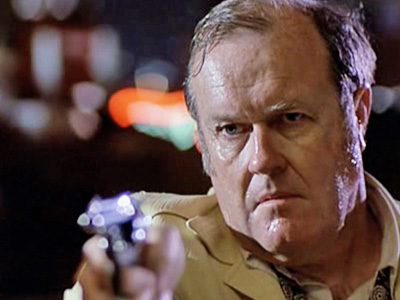 Pan now to a very “alive” and breathing Ray who has gone to the bar in hopes of getting his rightfully earned paycheck. Here, Ray finds Marty dead in his office, only after he accidentally sets off a pistol lying askew on the floor. Then, foolishly, he picks up the murder weapon. Of course the weapon is none other than Abby’s gun and one immediately suspects that Ray believes Abby to be the attempted killer. As he equally foolishly places the gun on the table he begins to try to clean up the murder scene, to no avail. Rather than clean the fingerprints off the gun, he cleans the floor. Then he takes Marty’s body, gun in his left pocket.